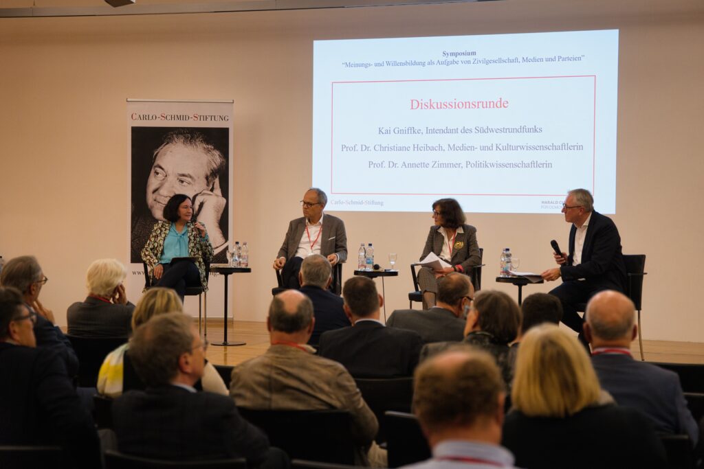Die Carlo-Schmid-Stiftung hat sich gemeinsam mit der Harald Christ Stiftung für Demokratie und Vielfalt der Frage nach der Meinungsbildung gewidmet und dabei zugleich den Auftakt zu einer Gesprächsreihe gemacht. An der ersten Veranstaltung im Haus der Katholischen Kirche in Stuttgart haben teilgenommen der Intendant des Südwestrundfunks (SWR), Herr Prof. Dr. Kai Gniffke, die Medienwissenschaftlerin Frau Prof. Dr. Christine Heibach vond er Universität Regensburg und die Politikwissenschaftlerin Frau Prof. Dr. Annette Zimmer von der Universität Münster. Die Moderation durch den Veranstaltungsabend lag in den Händen des Vorstandsvorsitzenden der Carlo-Schmid-Stiftung, Herrn Dr. Peter Kurz.